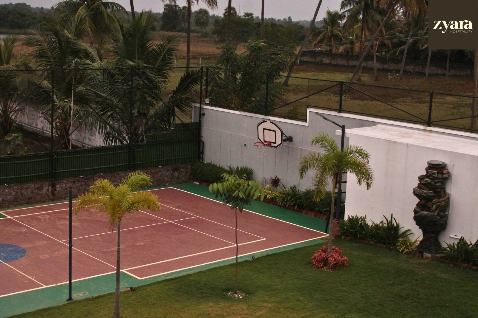 - Outdoor sports options include a basketball court and a volleyball/shuttle court.